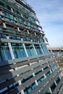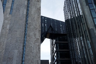 Zum Schluss habe wir uns noch Fassade und ein sehr innovatives Parkhaus der Unl Leipzig für Fahrräder angesehen. Der dreieckige Einschnitt an der rechtsseitigen Brücke des Paulinums entspricht übrigens dem ehemaligen Standort der Kirche vor der Sprengung. Das war ein sehr interessantes Detail, was man ohne Erläuterung gar nicht wahrnimmt. Ebenso erläuterungswürdig ist die unsymmetrische Anordnung des runden Fensters am ehemaligen Giebel der Kirche - jetzt Bestandteil der Front: Der Versatz symbolisiert nach Auffassung des Architekturbüros die Verwerfung durch die Sprengung, ebenso die sichtbare Fuge "Riss" oberhalb - das ist der Bruch in der Geschichte ...