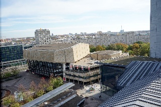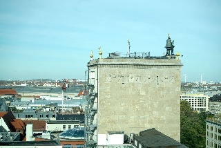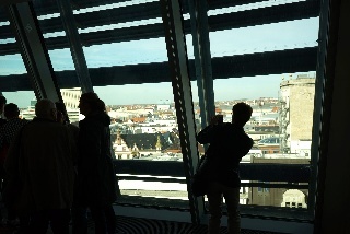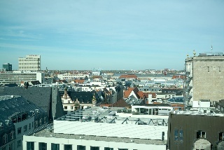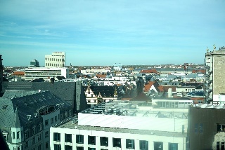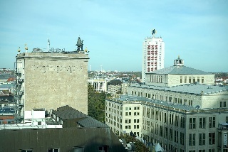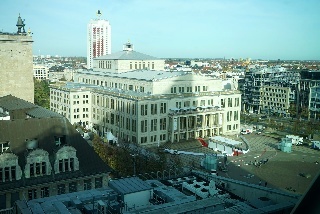 Zum Schluss sind wir noch mit dem Fahrstuhl (der ist öffentlich und kostet auch nicht mal was!) in die neunte Etage gefahren. Auf zwei Fensterfronten hat man einen herrlichen Ausblich auf die Ost-West-Achse von Leipzig von oben. Die Absperrung vor der Oper ist übrigens wegen des Opernballs (smile)