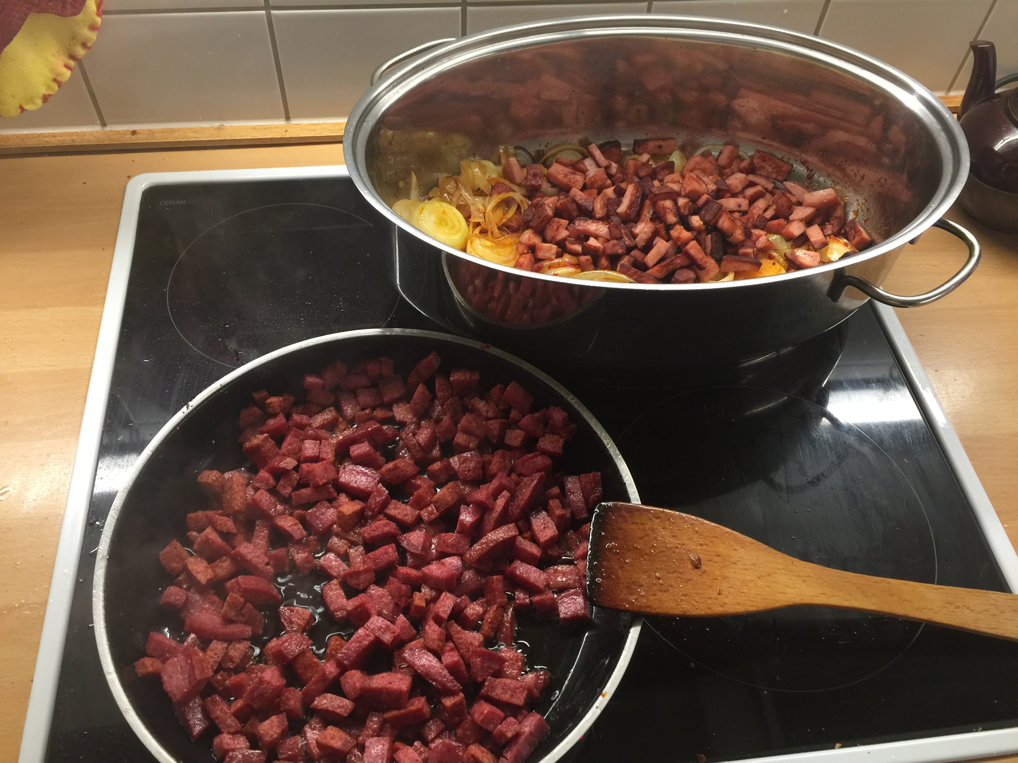 7. anschließend jeweils Jagdwurst, Salami und Kassler scharf anbraten und in den Topf geben