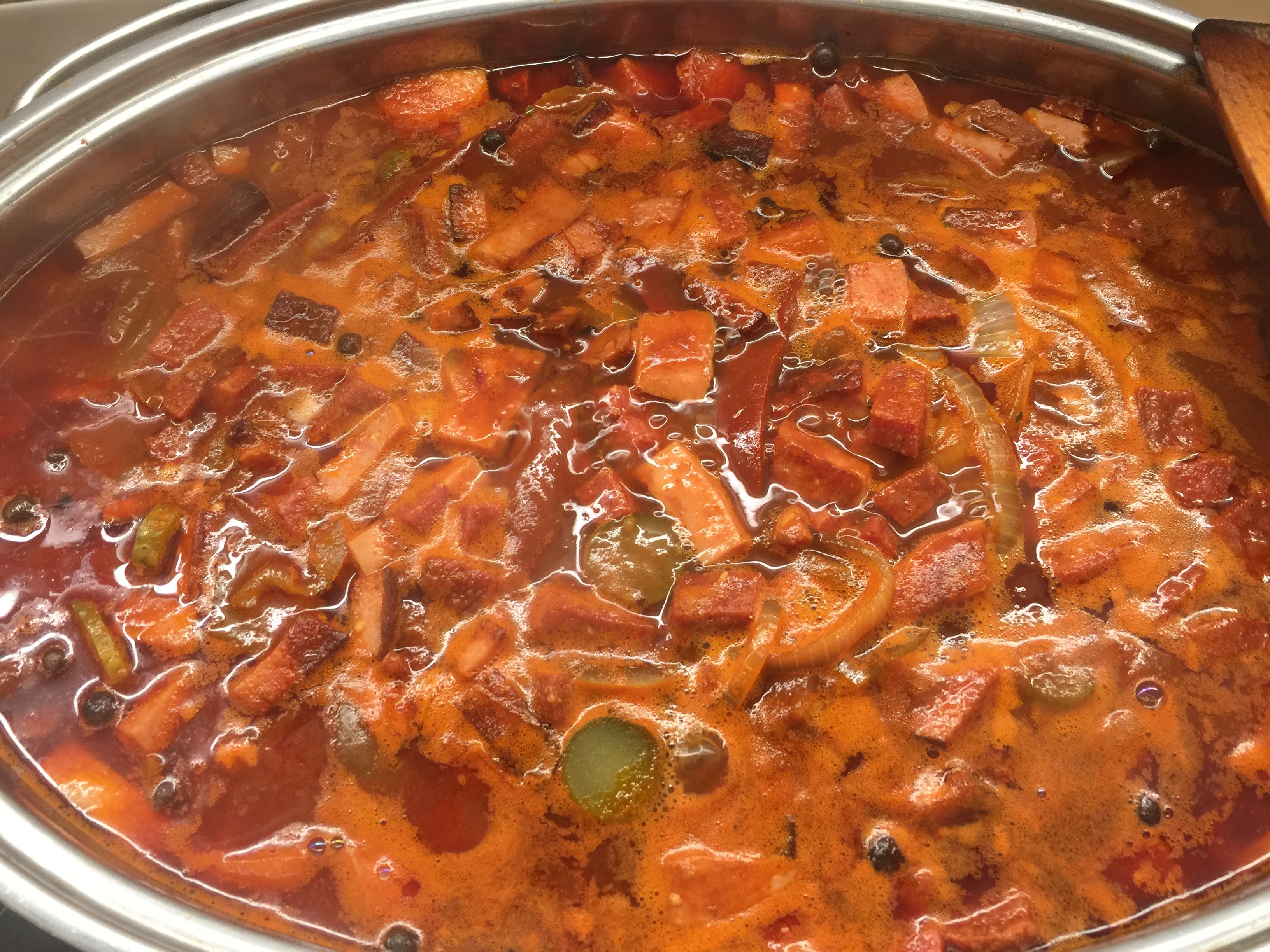 • Gewürze (4 Lorbeerblätter, Piment (~20), Pfefferkörner (30), eldelsüßer Paprika, Rosenparika, Chillies)
